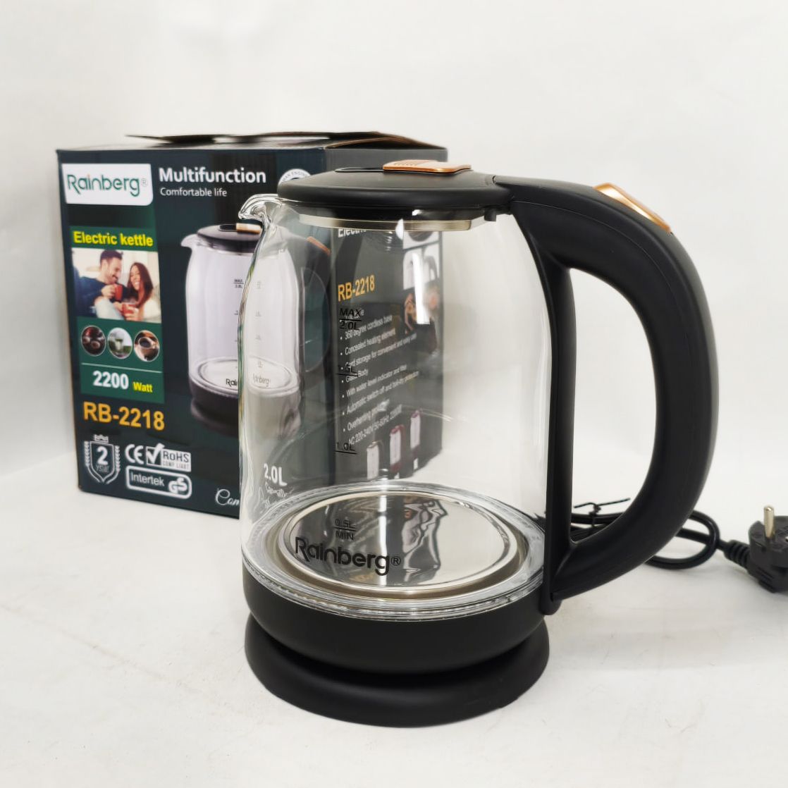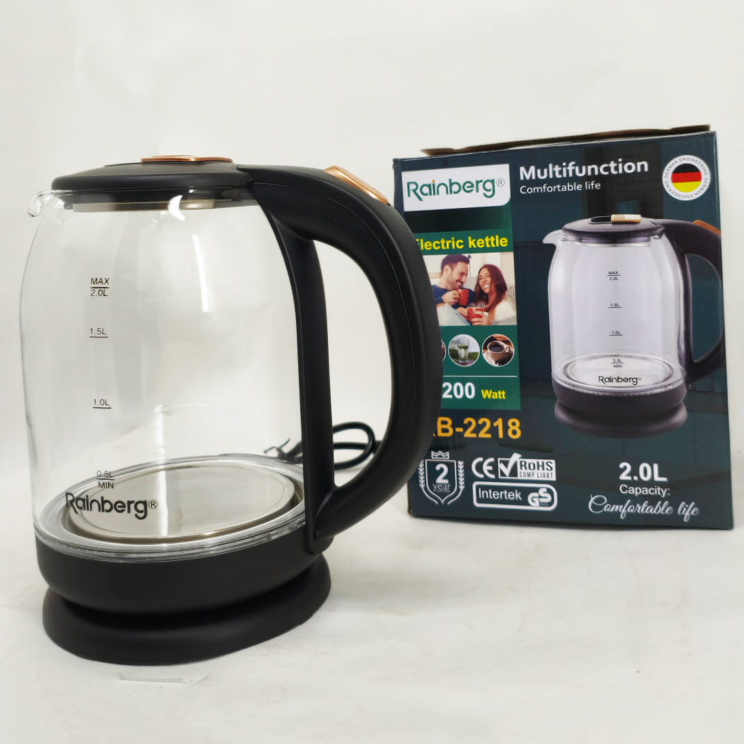 Rainberg RB 2218 відмінно підходить як для домашнього використання, так і для офісного простору. Він ідеальний для швидкого приготування гарячих напоїв – чаю, кави, настоїв трав. Завдяки великому об'єму в 2 літри, чайник задовольнить потреби родини або групи співробітників без необхідності постійно наливати воду заново. Функція автоотключення робить експлуатацію пристрою безпечною навіть у випадку забудькуватості користувача. Сучасний дизайн і скляний корпус додають привабливості робочому простору або кухні, гармонійно вписуючись у будь-який інтер’єр.