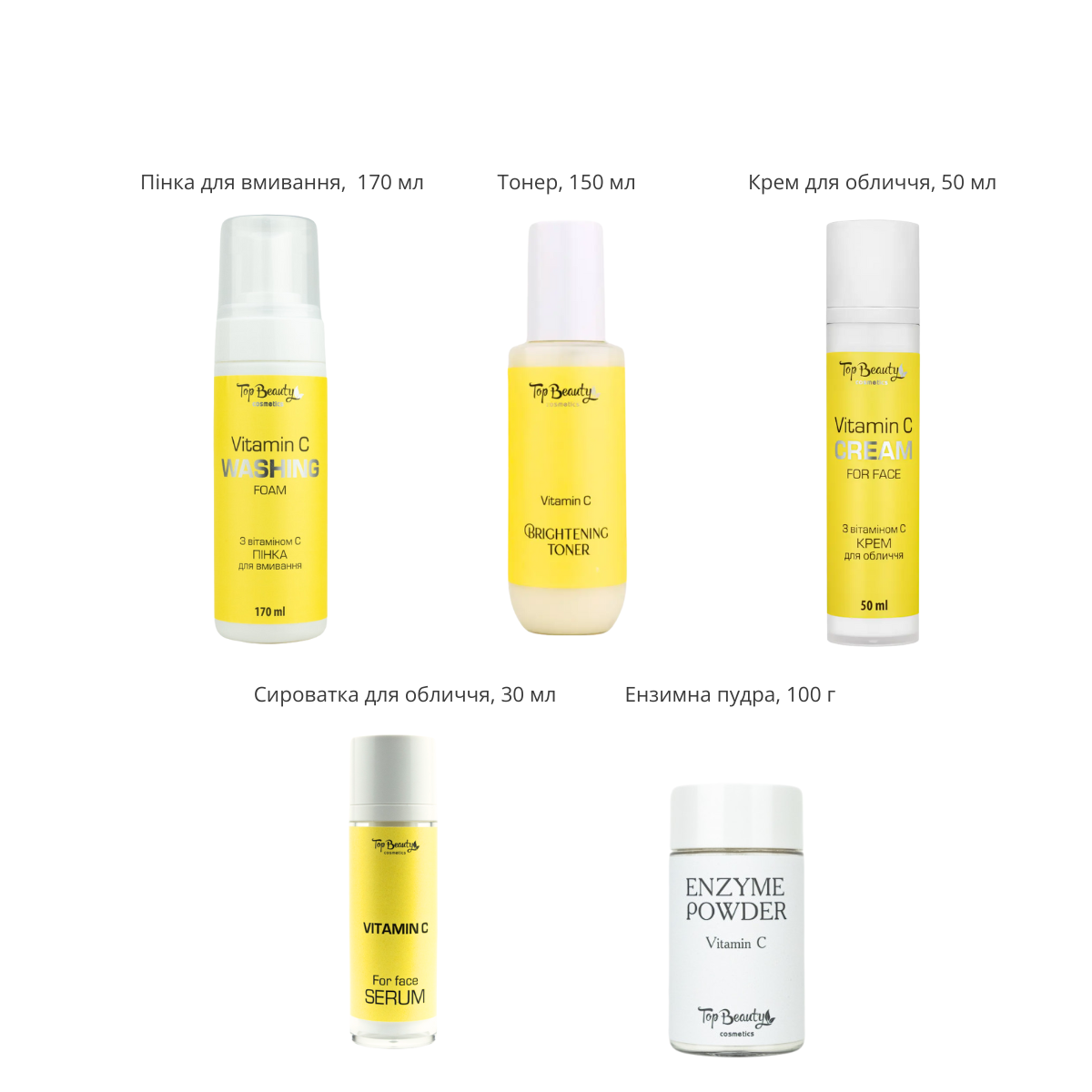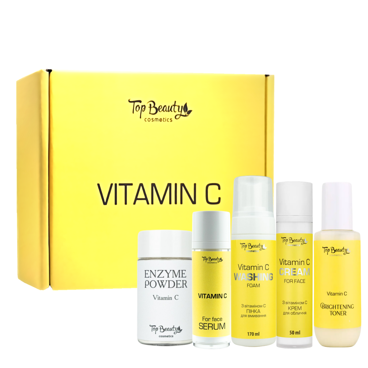 Жіночий набір косметики для обличчя Top Beauty Vitamin C 5 в 1 — крем, сироватка, пінка, тонер, ензимна пудраПодарунковий набір Top Beauty Vitamin C — повний комплекс для щоденного догляду за шкірою обличчя. Усі засоби містять стабільні форми вітаміну С, антиоксиданти та зволожувальні компоненти. Працюючи у тандемі, вони допомагають освітлити тон, зменшити пігментацію та повернути шкірі здорове сяяння. Набір підходить як для щоденного догляду, так і як стильний готовий подарунок жінці на будь-яке свято.Основні властивостіЯк працює бьюті-сет косметики з вітаміном С від Top Beauty:комплексно освітлює тон шкіри та зменшує пігментацію;