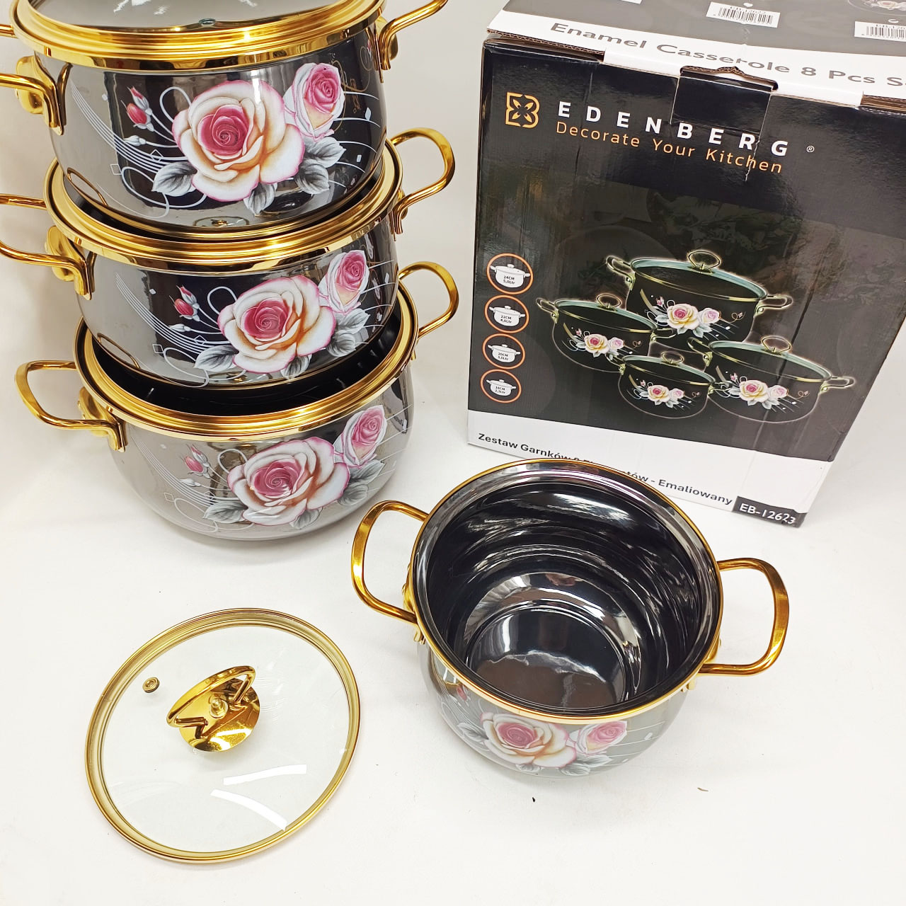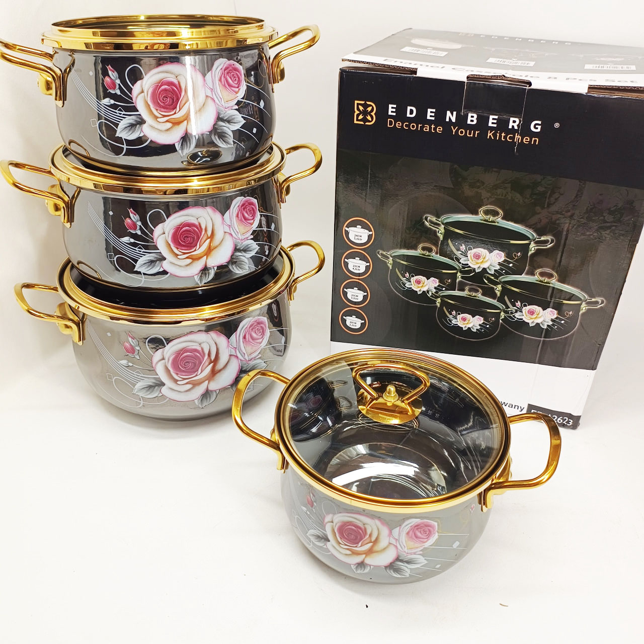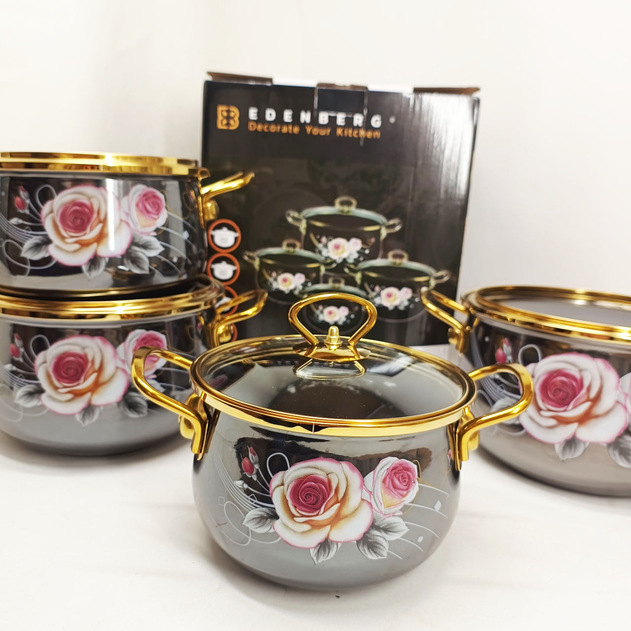 Набор эмалированных кастрюль Edenberg EB-12623 — это гармоничное сочетание изысканного дизайна и практичности для ежедневного использования. Черный цвет корпуса с нежным цветочным рисунком придает посуде элегантный внешний вид и делает ее стильным элементом кухонного интерьера.