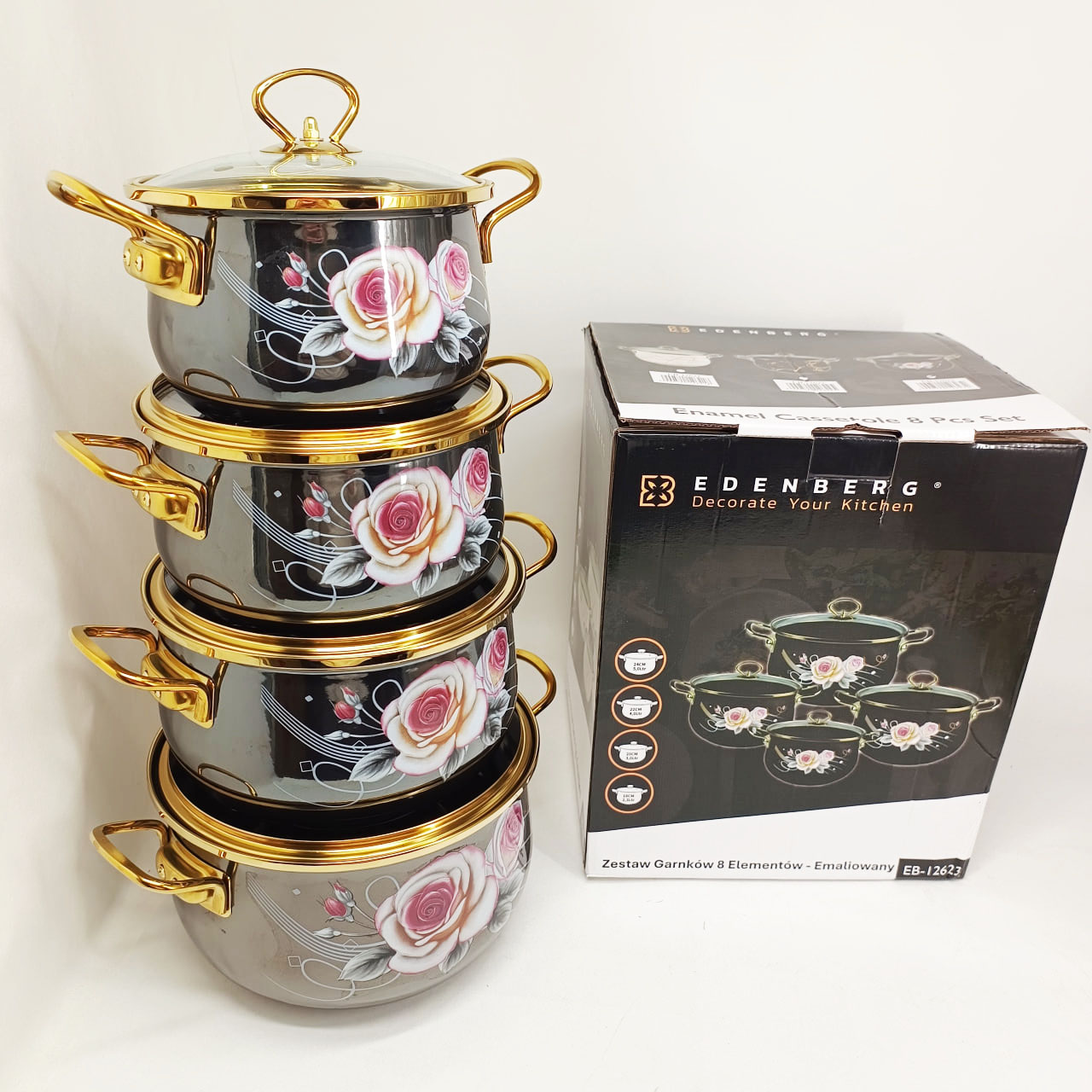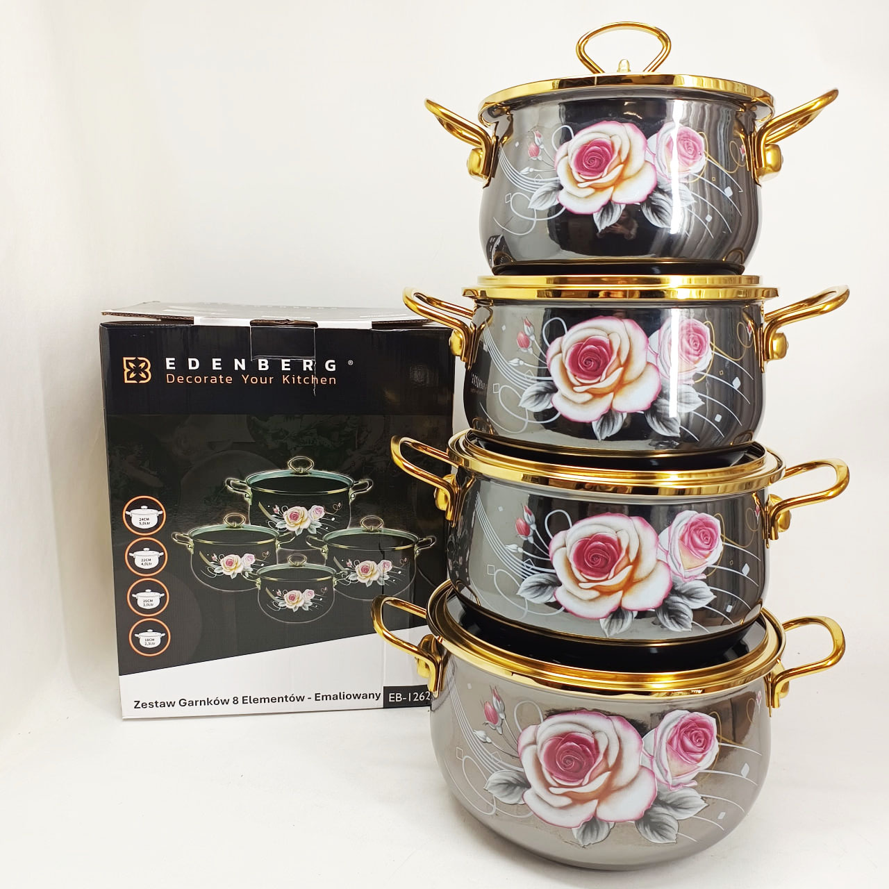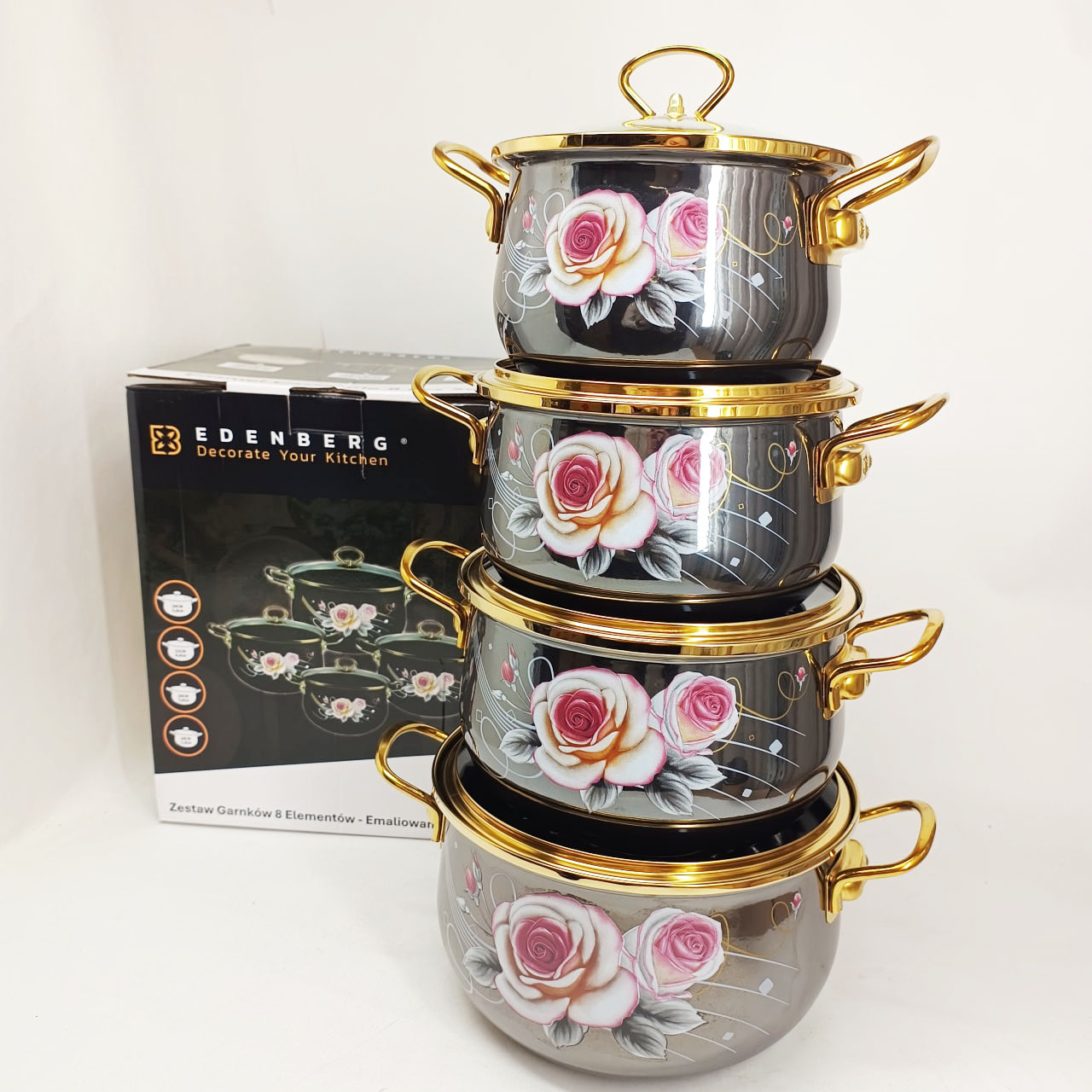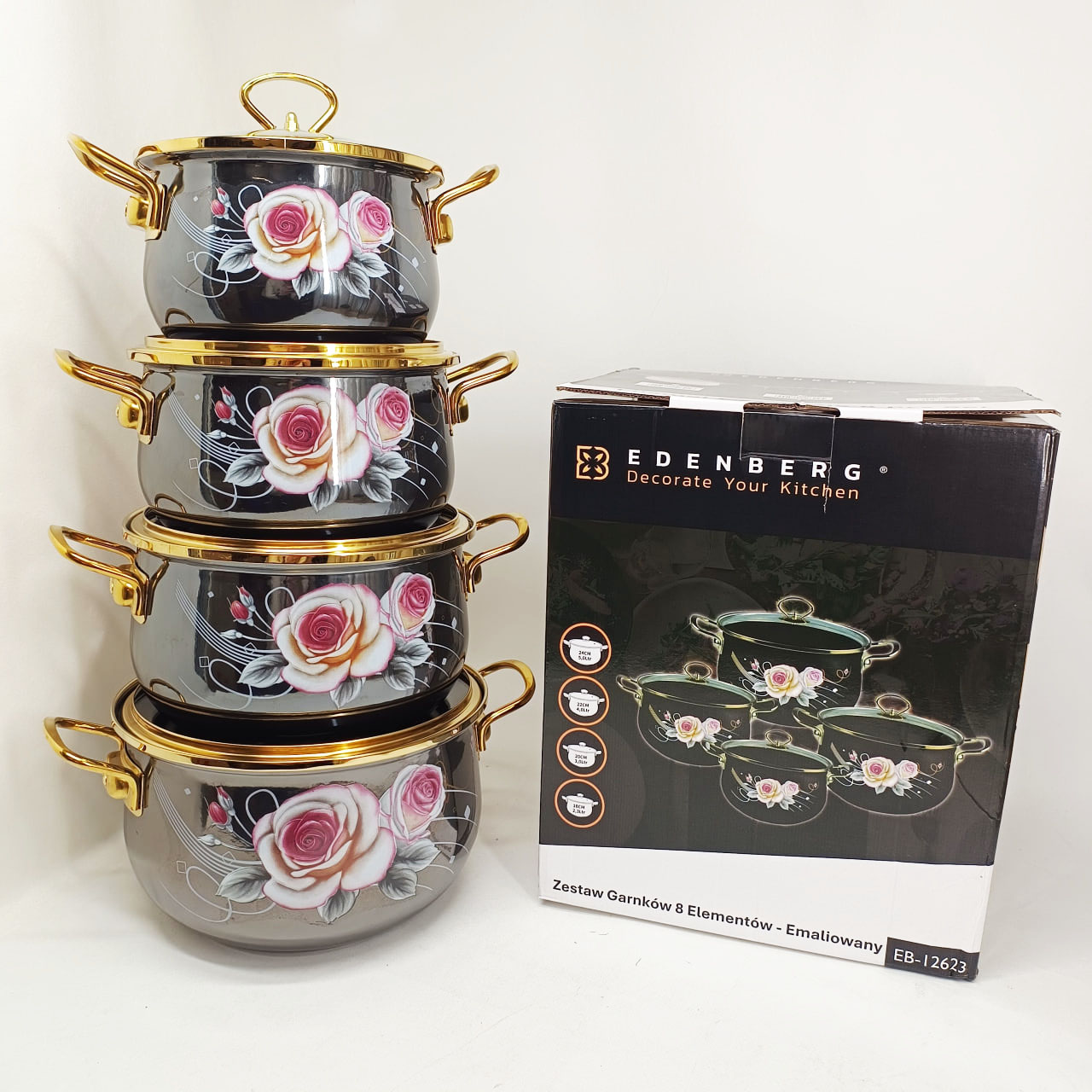Набор эмалированных кастрюль Edenberg EB-12623 — это гармоничное сочетание изысканного дизайна и практичности для ежедневного использования. Черный цвет корпуса с нежным цветочным рисунком придает посуде элегантный внешний вид и делает ее стильным элементом кухонного интерьера.