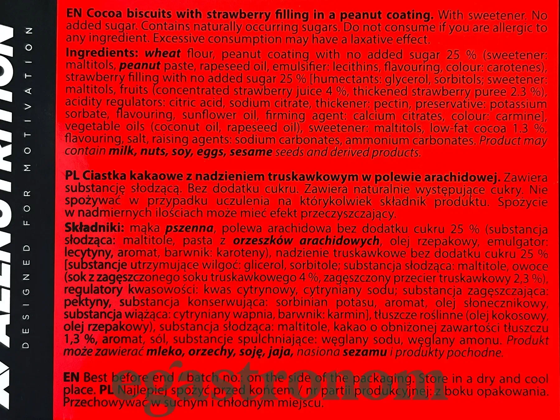 Білкове печиво з какао-бісквітом, покрите арахісовою глазур’ю і з ніжною полуничною начинкою без доданого цукру. Ідеальний баланс солодкого й горіхового смаків. Без пальмової олії, без цукру — лише натуральна насолода для тих, хто дбає про себе.