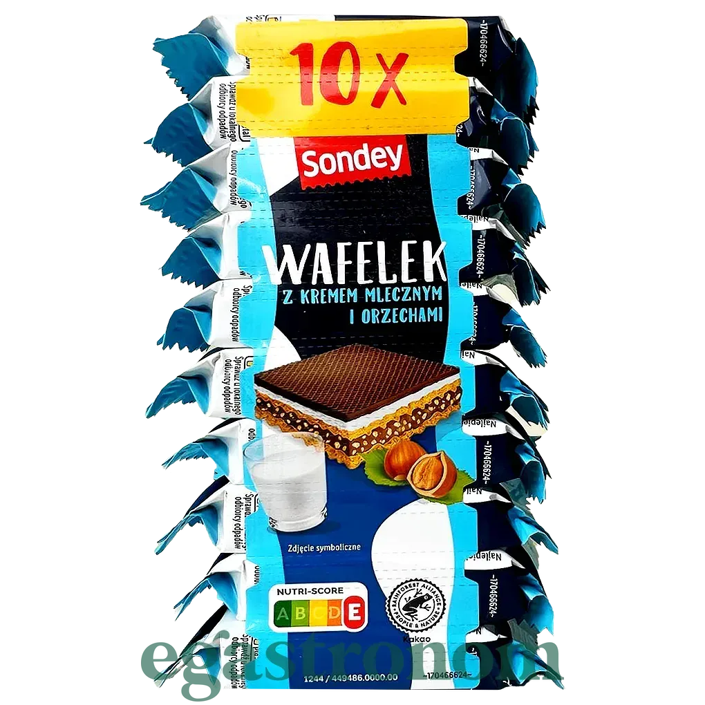 Хрусткі вафлі Sondey, прошаровані горіховим кремом з шматочками лісових горіхів і кремом зі смаком молока, покриті какао-глазур'ю. Ідеальні для солодкої перерви в будь-який час дня.