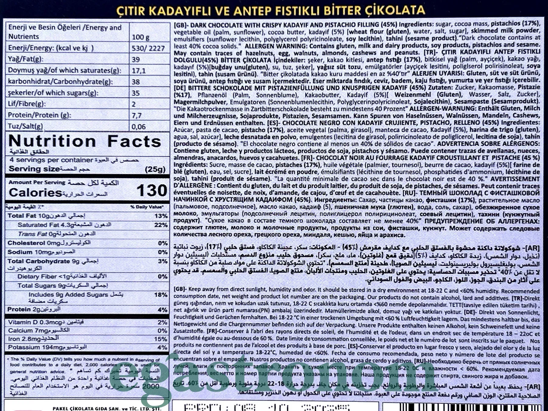 Розкішна східна насолода — темний шоколад із хрустким кадаїфом і фісташковою начинкою. Насичений смак, делікатна текстура та аромат горіхів створюють справжню дуетну гармонію Сходу й шоколаду.