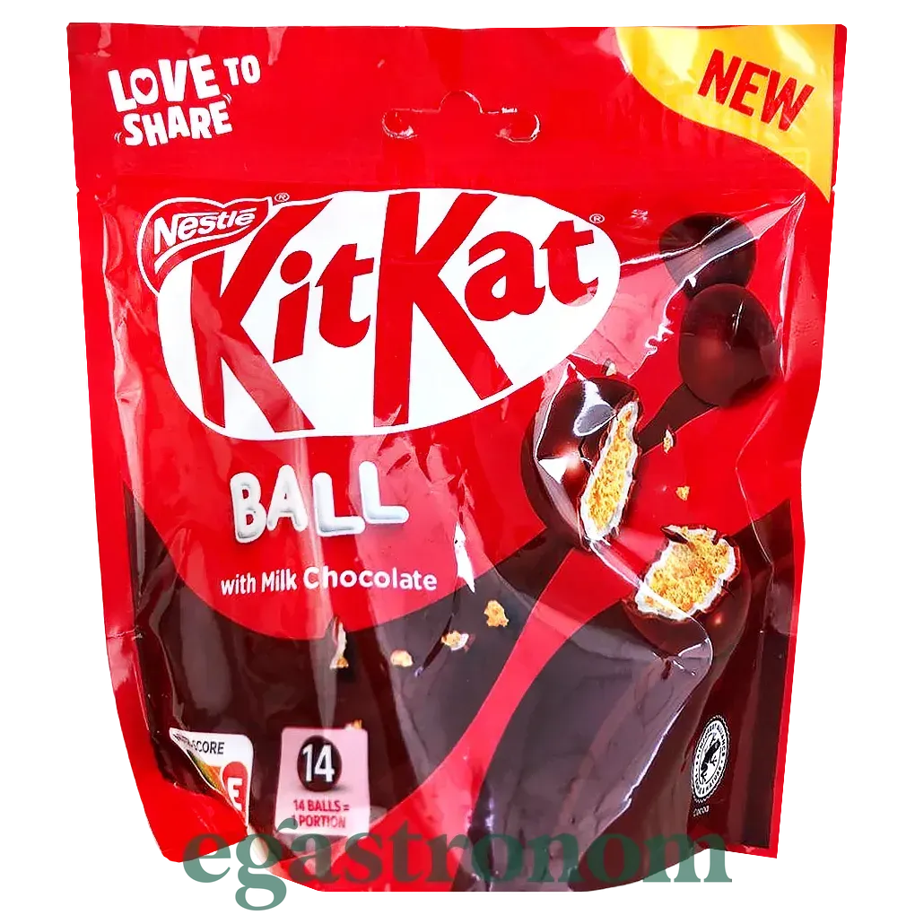 Кульки з хрустких злаків, вкриті ніжним молочним шоколадом KitKat. Ідеальний формат для перекусу або солодкого задоволення в компанії.
