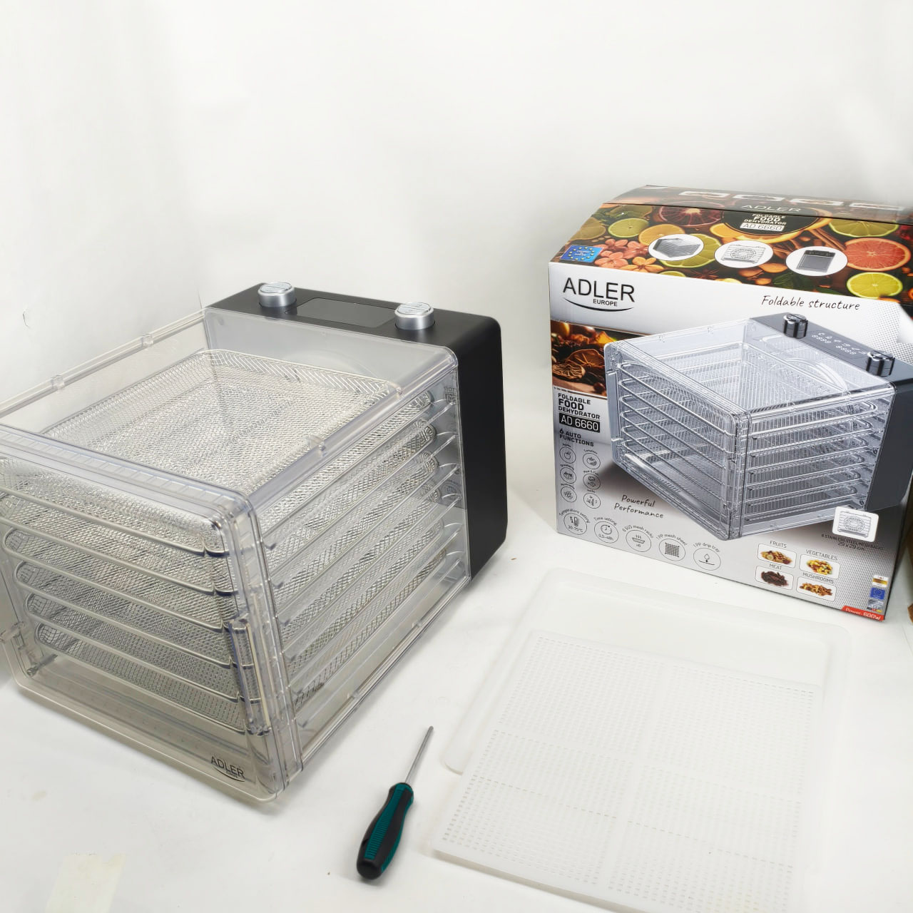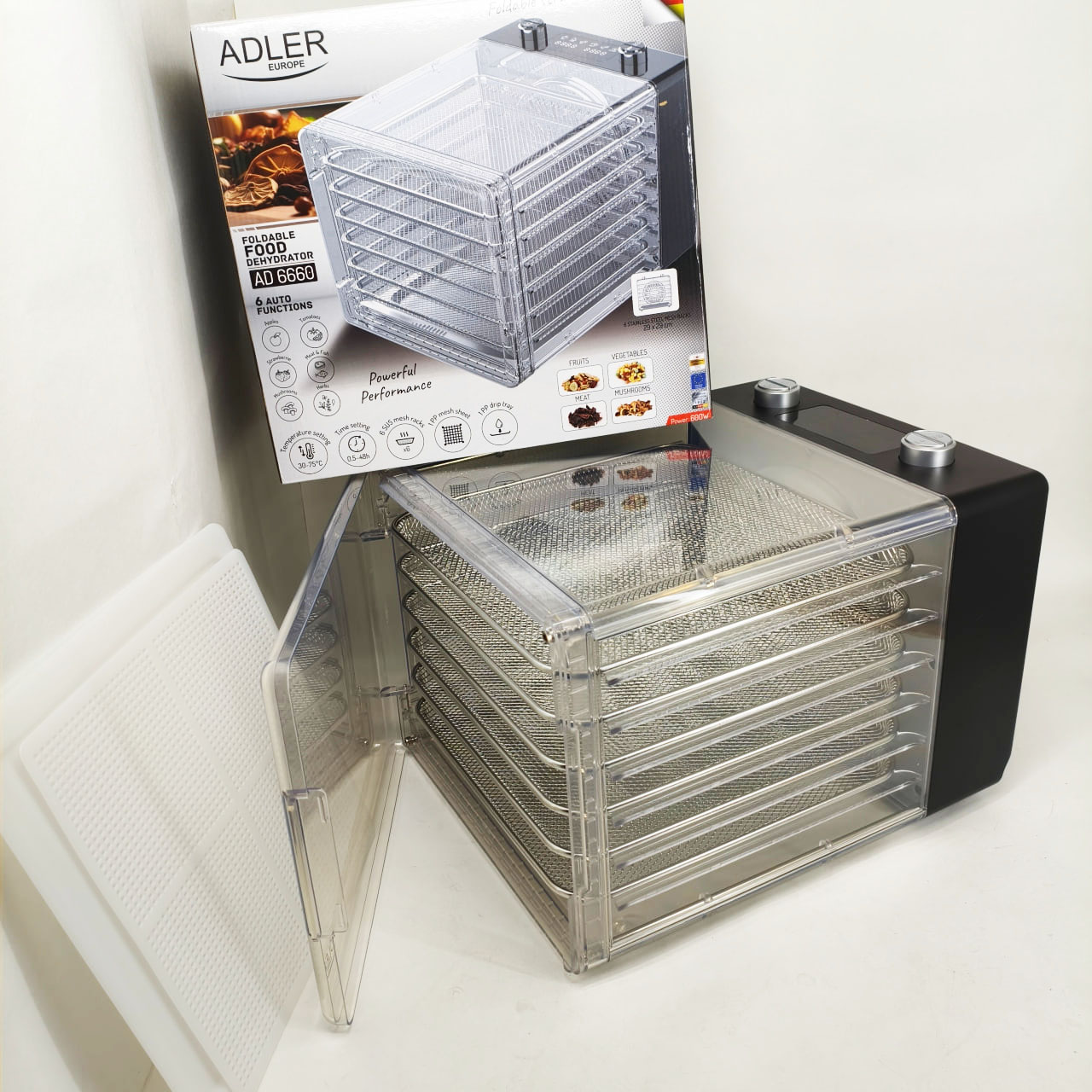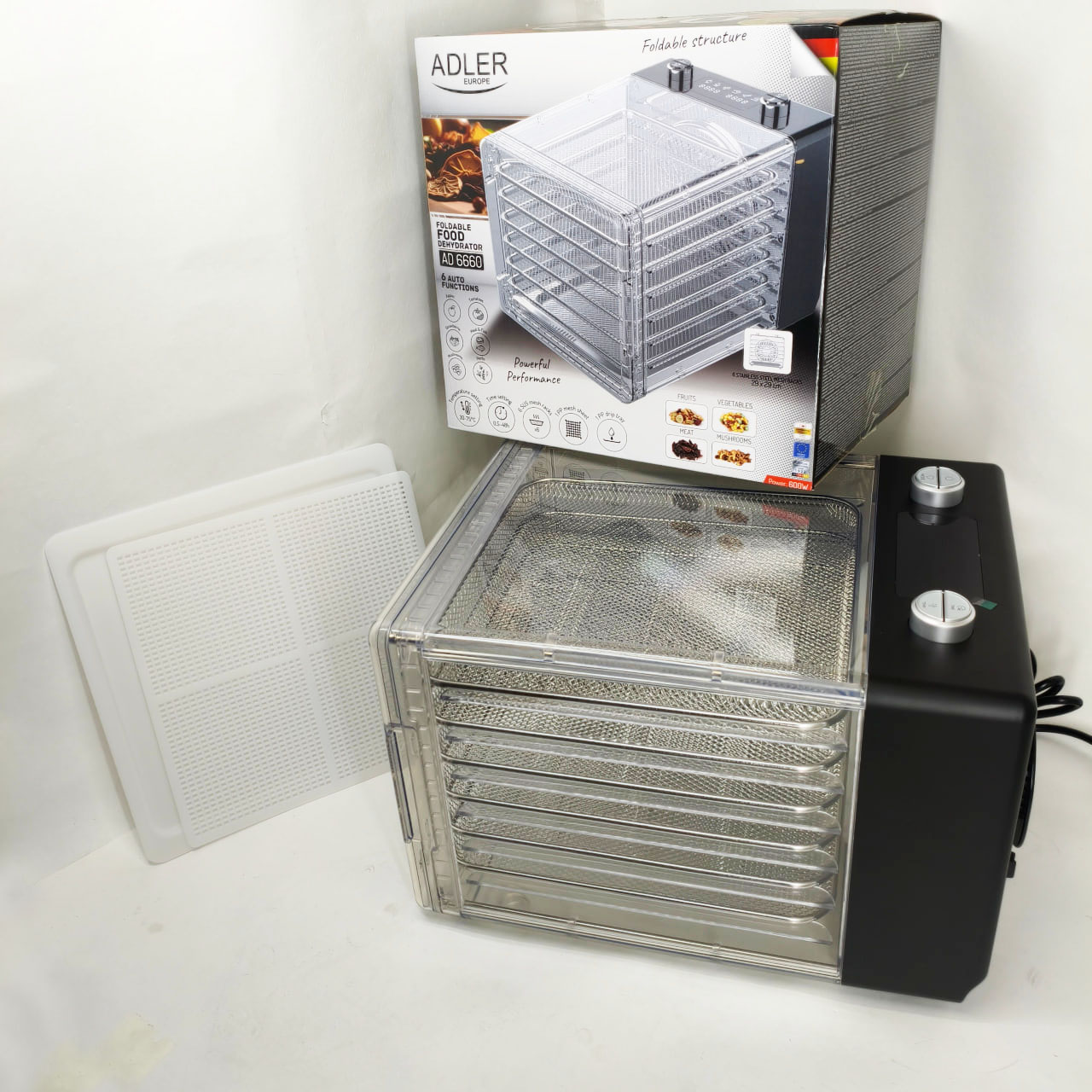 Сушка для овощей и фруктовAdler AD 6660— функциональный прибор для домашнего использования. Оснащена 6 лотками из нержавеющей стали, позволяет одновременно сушить большое количество продуктов. Благодаря цифровому управлению пользователь может точно установить температуру и продолжительность сушки. Дополнительные аксессуары — сетка для мелких продуктов и поддон для капель — делают процесс максимально удобным и гигиеническим.