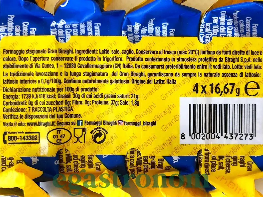 Biraghi Biraghini Snack – це порційний італійський сир пармезан у зручному форматі для перекусу. Виготовлений з якісного коров’ячого молока, він має насичений смак, зернисту текстуру та характерний аромат витриманого пармезану. Ідеальний варіант для швидкого перекусу, додавання до салатів або пасти.