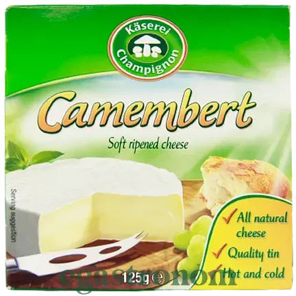 Camembert - м'який вершковий сир з ніжною консистенцією і оболонкою, покритою білою пліснявою. Камамбер досить жирний і м'який. Для його виробництва використовують незбиране коров'яче молоко, іноді до цільного молока додають незначну кількість знежиреного молока. Чим більше часу проходить з моменту дозрівання сиру, тим більш насиченим і пікантним ароматом він володіє. Сирна головка покрита злегка пухнастою скоринкою з гострим смаком з яскраво вираженою грибний ноткою. ТОП запити Купити сир маскарпоне Купити чай Ціна шоколадки Купити вітаміни Засоби особистої гігієни Вартість борошна Купити соуси