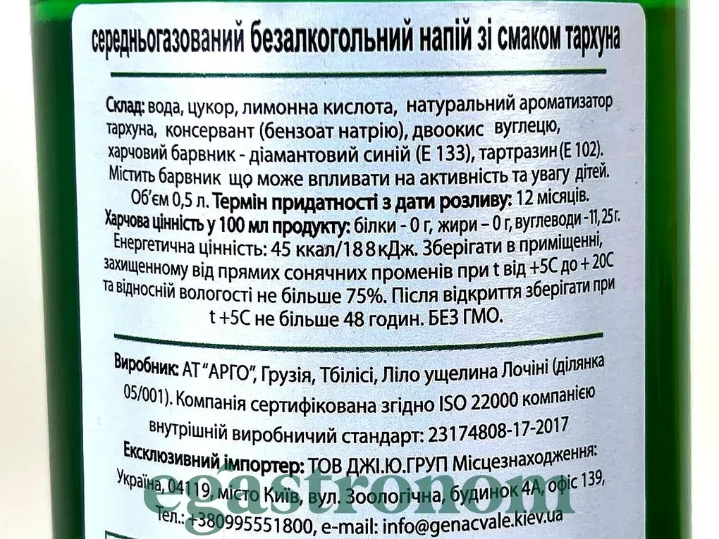 Традиційний грузинський напій з яскравим зеленим кольором і характерним ароматом тархуну. Має солодкий, злегка анісовий смак, що освіжає та бадьорить. Кількість на палеті: 780 шт.
