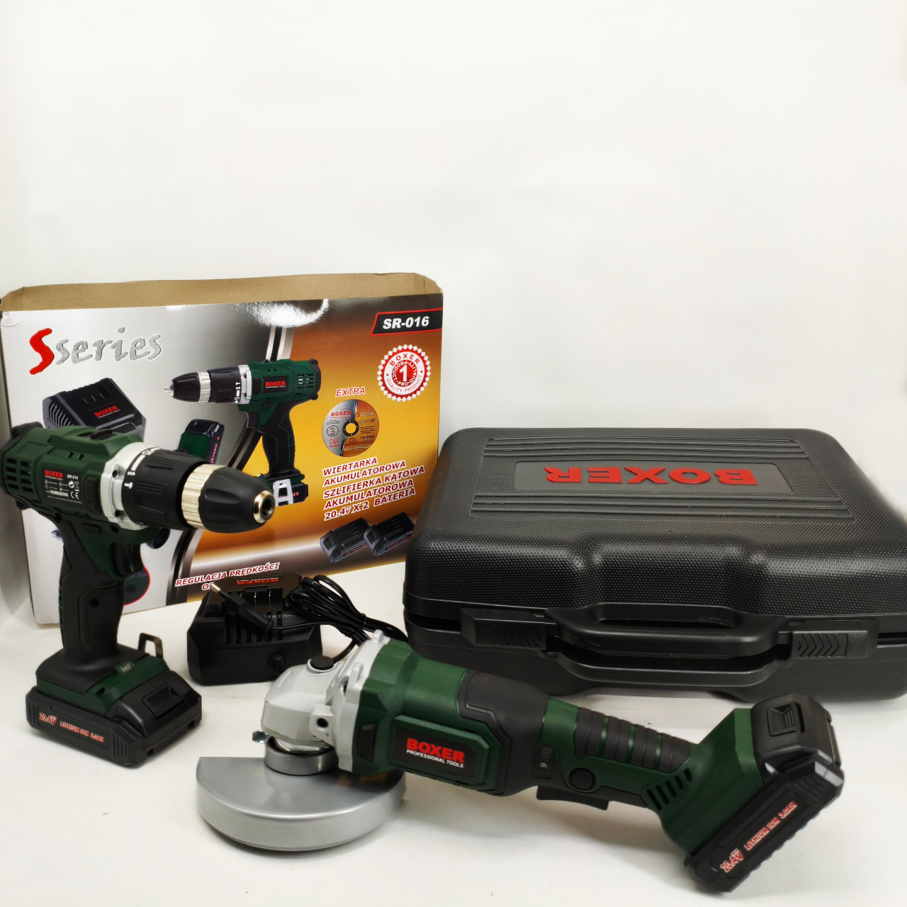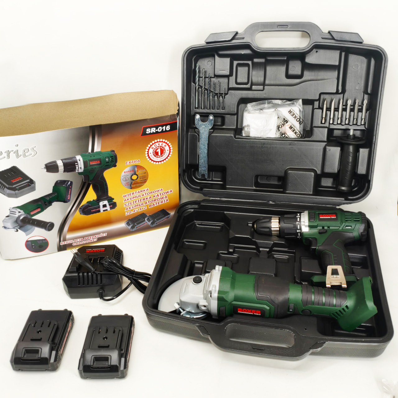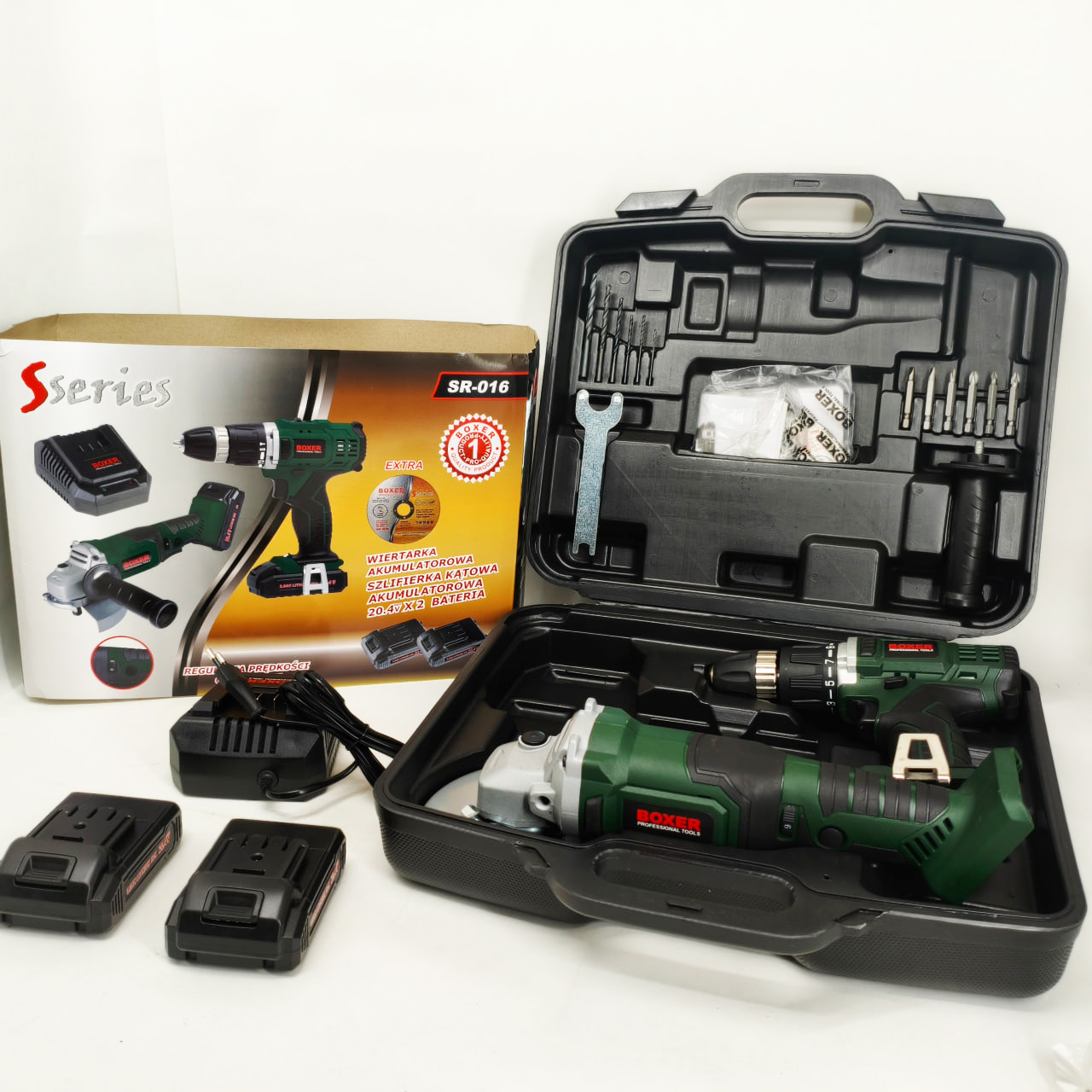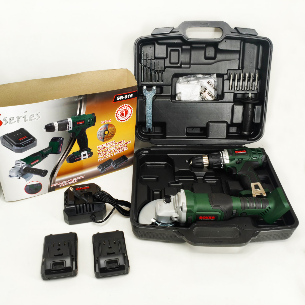 Boxer SR016 Combo Set – это идеальное решение как для любителей DIY, так и для профессионалов. Этот всеобъемлющий комплект содержит мощную аккумуляторную дрель-шуруповерт, универсальную аккумуляторную угловую шлифмашину, две долговечные батареи и ряд аксессуаров - все в удобном кейсе для переноски. Легко справляйтесь с задачами сверления, завинчивания, шлифовки и резки и уверенно беритесь даже за самые сложные проекты.