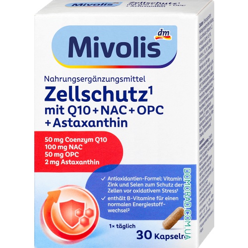 Капсули Mivolis Cell Protection з Q10 + NAC + OPC + Astaxanthin містять антиоксидантну формулу – ретельно підібрану комбінацію вітамінів та мінералів. Пантотенова кислота сприяє нормальній розумовій діяльності, а вітамін B1 – нормальній роботі серця. Біотин сприяє підтримці нормального стану шкіри та волосся. Вітамін C підтримує нормальну функцію імунної системи. Додаткові інгредієнти, такі як коензим Q10, астаксантин, N-ацетил-L-цистеїн (NAC) та олігомерні проантоціанідини (OPC) з екстракту виноградних кісточок, доповнюють цю формулу. Вітаміни C та E, а також цинк та селен сприяють захисту клітин від оксидативного стресу. Цинк також відіграє певну роль у поділі клітин. Вітаміни B2, B6 та B12 сприяють нормальному енергетичному обміну, зменшенню втоми та виснаження, а також підтримують нормальну функцію нервової системи.