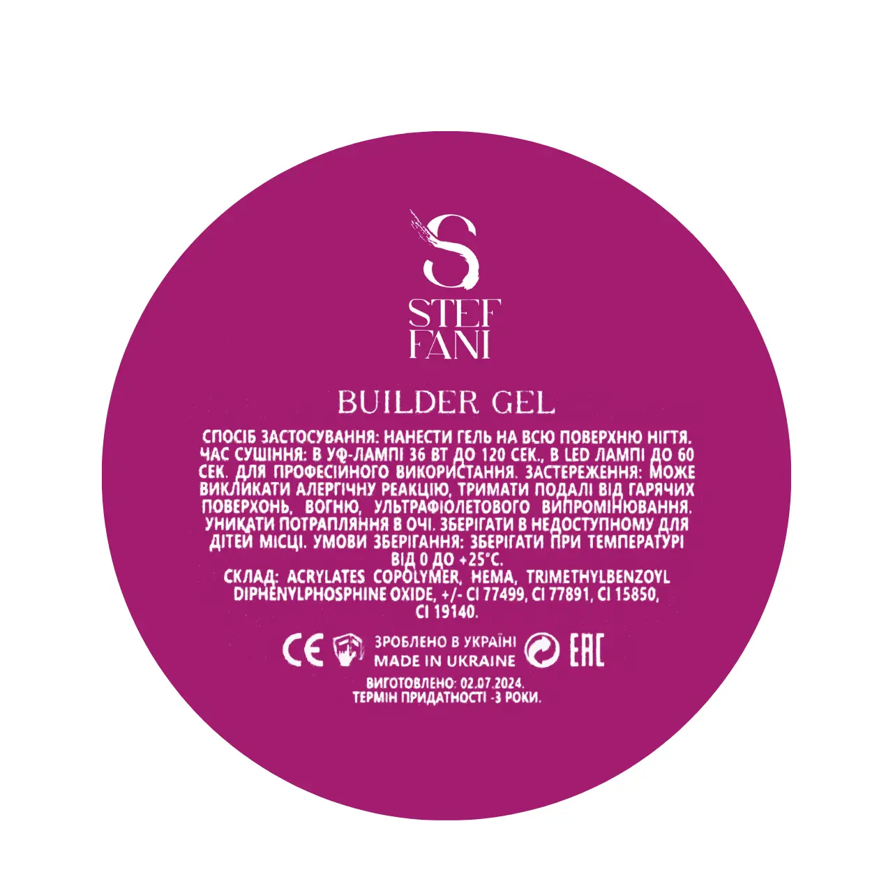 Гель для нарощування нігтів Steffani Builder Gel 15 млSteffani Builder Gel — професійний гель для моделювання, нарощування та укріплення нігтів. Має оптимальну в’язкість, добре тримає форму та самовирівнюється, що дозволяє створювати міцні та акуратні нігті без затікань.Основні властивостіпідходить для нарощування та моделювання нігтів; має середню самовирівнюючу в’язкість; легко розподіляється та не затікає; утворює міцне та стійке покриття; підходить для укріплення натуральних нігтів; полімеризується в UV та LED лампах; зручний об’єм 15 мл;Активні компонентиолігомери та мономери — забезпечують пластичність та формування матеріалу; фотоініціатори — активують полімеризацію в лампі;Для кого підходитьдля майстрів манікюру будь-якого рівня; для роботи на типсах та формах; для укріплення ламких або тонких нігтів;Ефект від застосуванняРезультат використання Steffani Builder Gel:міцні та стійкі нігті без сколів; акуратна рівна архітектура; довготривале носіння покриття; естетичний, доглянутий вигляд манікюру;Спосіб застосуванняпідготуйте нігтьову пластину стандартним способом; нанесіть базовий шар при необхідності; виконайте моделювання гелем; полімеризуйте в UV/LED лампі відповідно до інструкції; нанесіть колір або топове покриття;СкладОлігомери, мономери, фотоініціатори. Повний склад вказаний на упаковці виробника.Об’єм і форма випускуБаночка 15 мл.