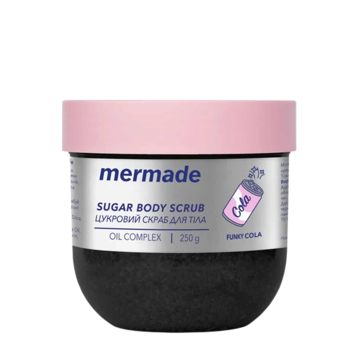 Цукровий скраб для тіла MERMADE Funky Cola з цукром, рисовою пудрою та олією жожобаСкраб для тіла цукровий MERMADE Funky Cola — це ефективне відлущення та гладкість рівня “wow”. Делікатна формула на основі цукру та рисової пудри м’яко оновлює шкіру, а аромат карамельної коли з пряними нотками перетворює догляд на справжній ритуал задоволення.Основні властивості скрабу для тіла MERMADE Funky ColaЯк працює:делікатно відлущує ороговілі клітини шкіри; вирівнює текстуру та покращує тон шкіри; стимулює оновлення та робить шкіру більш гладкою; пом’якшує та підтримує природний баланс зволоження; залишає на шкірі солодкий аромат карамельної коли.Активні компонентиЯк діють активи боді-скрабу:цукор — ефективно відлущує, полірує шкіру та надає їй гладкості; рисова пудра — м’яко очищує, вирівнює рельєф і надає шкірі шовковистості; олія жожоба — живить, пом’якшує та підтримує еластичність шкіри.Кому підходитьЦей засіб ідеальний для:тих, хто шукає цукровий скраб для тіла з яскравим ароматом; регулярного оновлення та очищення шкіри; підготовки шкіри до нанесення автозасмаги або крему; домашнього SPA-догляду.Ефект від використання скрабу для тіла MERMADE Funky Colaшкіра стає гладенькою та м’якою на дотик; з’являється здорове природне сяяння; зменшується сухість і лущення; тіло огортає приємний солодко-пряний аромат.Спосіб використанняНанесіть невелику кількість скрабу на вологу шкіру тіла. Масажуйте круговими рухами, приділяючи увагу проблемним зонам. Змийте теплою водою та за потреби нанесіть зволожувальний крем. Використовуйте 1–2 рази на тиждень.Об’єм та форма випускуОб’єм: 250 г.Форма випуску: баночка.