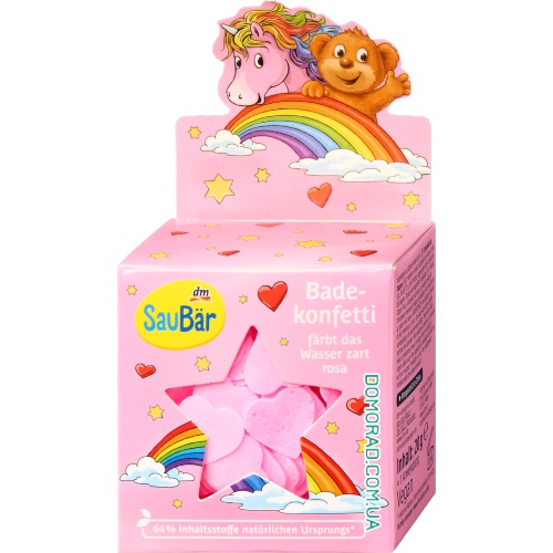 Конфетті для ванни SauBär блакитного або рожевого кольору перетворять кожне прийняття ванни на ароматну пригоду. Різні форми, такі як серця або зірки, додають різноманітності та веселих кольорів воді. У той час як форма серця виділяє приємний ванільний аромат і ніжно забарвлює воду в рожевий колір, форма зірки дивує свіжим персиковим ароматом та світло-блакитним відтінком. Завдяки своїй м’якій, безпечній для шкіри формулі, прийняття ванни стане вдвічі веселішим. Це конфетті для ванни стане чудовим подарунком або приємним сюрпризом для дітей віком від 3 років. Цей товар доступний у різних дизайнах. На жаль, попередньо вибрати конкретний дизайн під час замовлення неможливо.