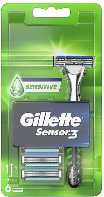 Чоловіча бритва Gillette Sensor 3 Sensitive оснащена трьома лезами і смужкою Lubrastrip для гладкого ковзання. Леза Sensor, встановлені на пружинах, адаптуються до рухомої голівки Gillette Sensor 3, підлаштовуючись під форму обличчя і забезпечуючи комфортне і гладке гоління. Леза Sensor підходять до всіх бритв Sensor.