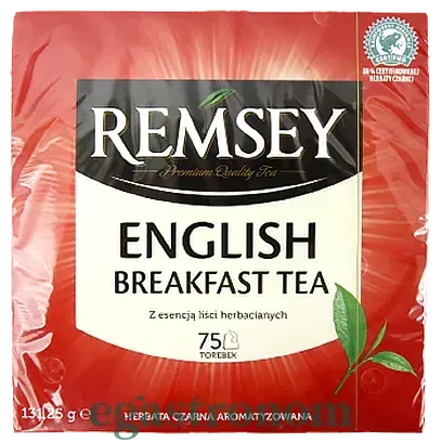 Чай Рамсей пакетиках англійський сніданок - 75 пакетиків преміум чаю з ярликами. Рамсей класичний чорний чай, преміум класу, від торгової марки "Biedronka, упаковані в стильній коробці. 131,25 грама найдобірнішого чаю, вирощеного на плантаціях Кенії та Малаві. У складі - 98% сумішей чайного листя та 2% ароматизатори, у тому числі з чайного листя. ТОП запити