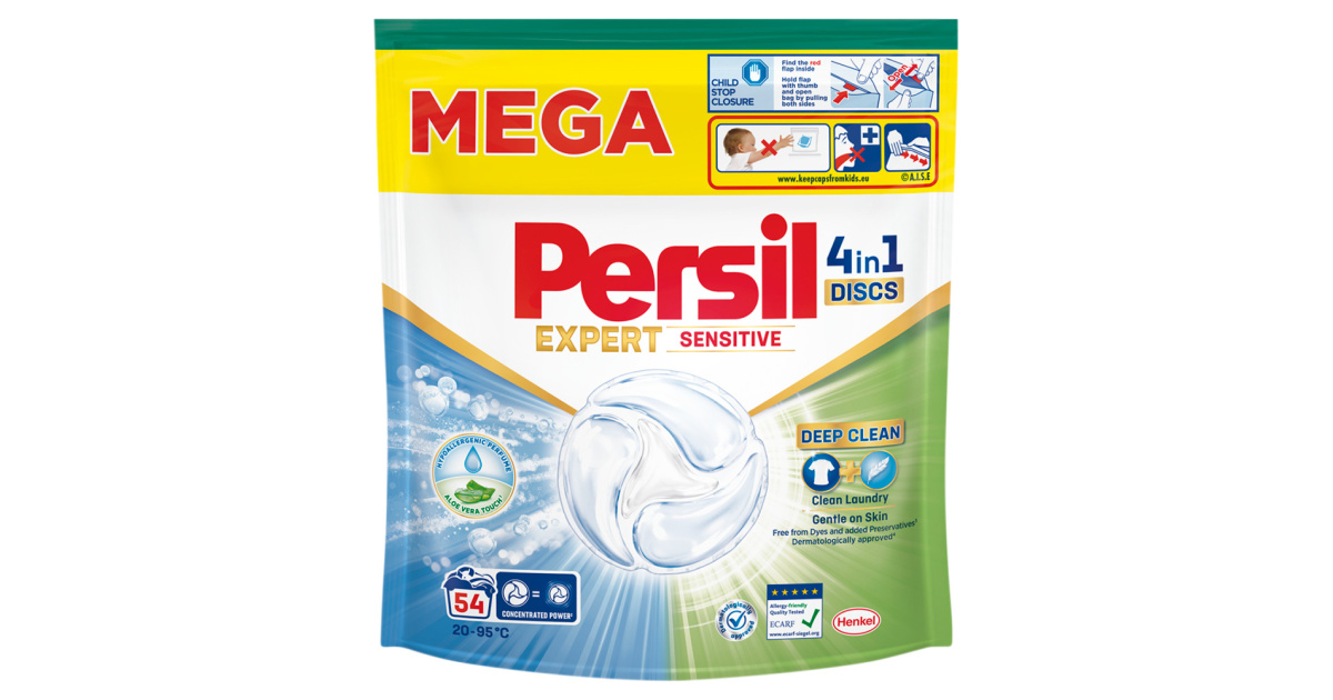 Persil Discs Expert Sensitive - це ніжні миючі капсули, спеціально розроблені для людей з чутливою шкірою, алергією та дітей. Ці інноваційні чотирикамерні капсули поєднують потужну дію очищення з максимальною м'якістю. Вони містять натуральні інгредієнти, такі як мило та алое вера, гіпоалергенний аромат і не містять консервантів і барвників. Дерматологічно перевірена та сертифікована формула розроблена для забезпечення ідеальної чистоти та захисту шкіри. Крім того, капсули PERSIL Discs Expert Sensitive є стійкими завдяки упаковці, що підлягає переробці, та біорозкладаним інгредієнтам.