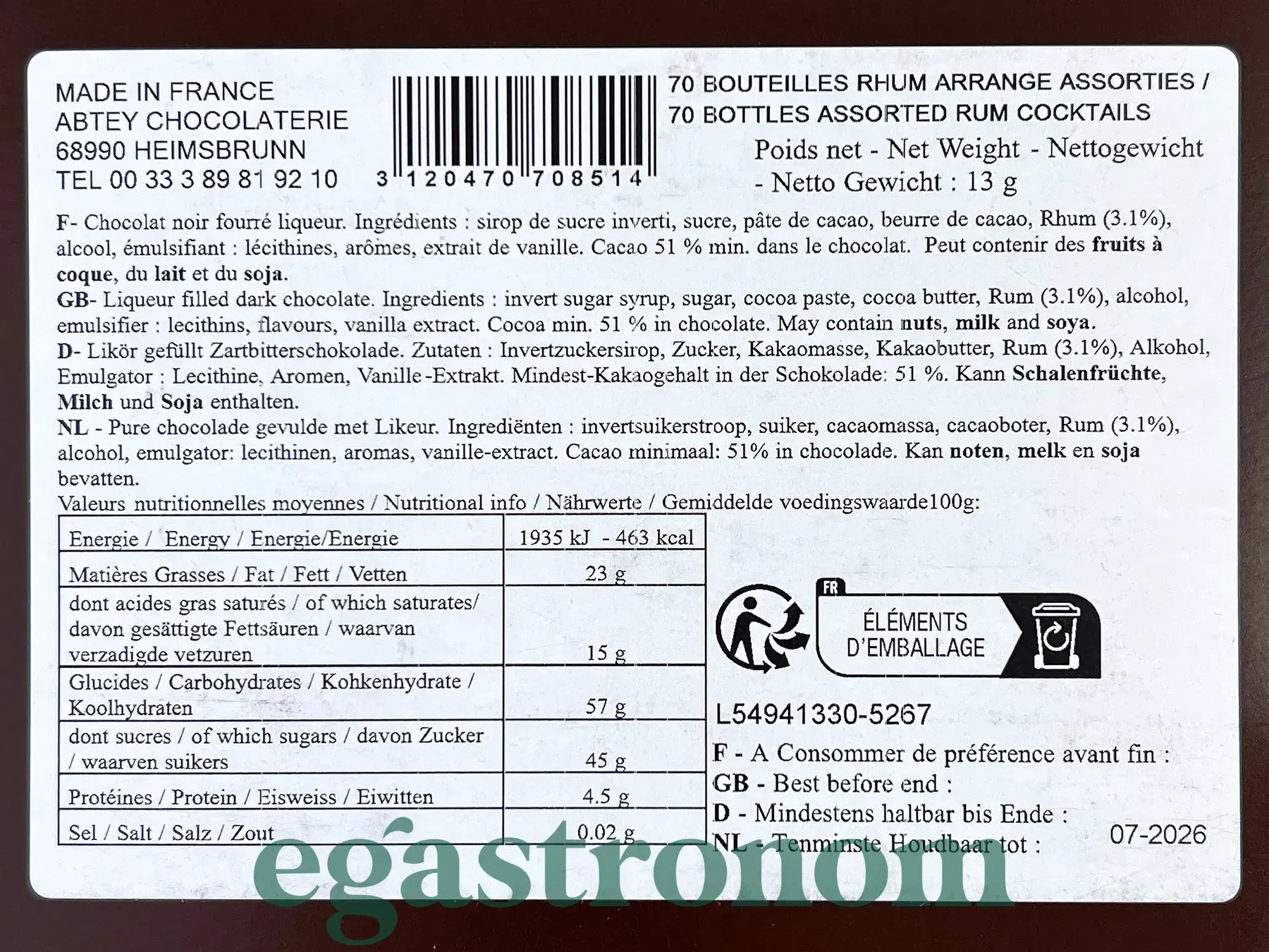 Шоколадні цукерки асорті (пляшечки) з ромом Абтей Abtey Rhum Arrange Assorted 910g 6шт/ящ. Изображение №2